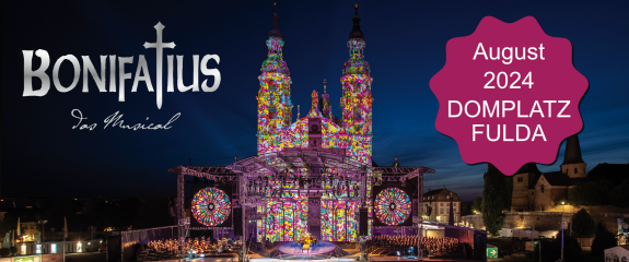 Im Blick auf das BONIFATIUS-MUSICAL gibt es einen eigenen Flyer für unsere Kirchengemeinden. In der Heftmitte finden Sie einige Hinweise zum Rahmenprogramm, das das Bistum anbieten wird – darunter ein Bistumsabend am 28. August 2024 oder auch die Möglichkeit, für einige kirchliche Gruppen vor der Aufführung ein Catering im Bischofsgarten zu buchen. Für Pfarreigruppen gibt es Musical-Karten zu Sonderkonditionen, die direkt von Spotlight Musicals angeboten werden und die Sie in der Geschäftsstelle erfragen können. Ich freue mich, wenn wir uns bei einer der Aufführungen in Fulda sehen!